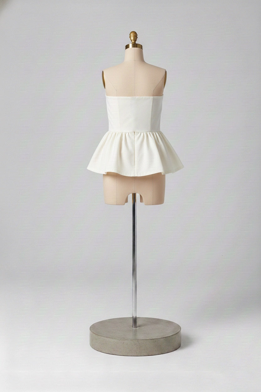 A Bata Tomara que Caia Diana é uma peça que transforma qualquer look básico em uma produção memorável. Com uma modelagem que remete ao clássico estilo new look, ela combina um busto ajustado e estruturado com uma saia peplum volumosa, criando uma silhueta feminina e imponente.