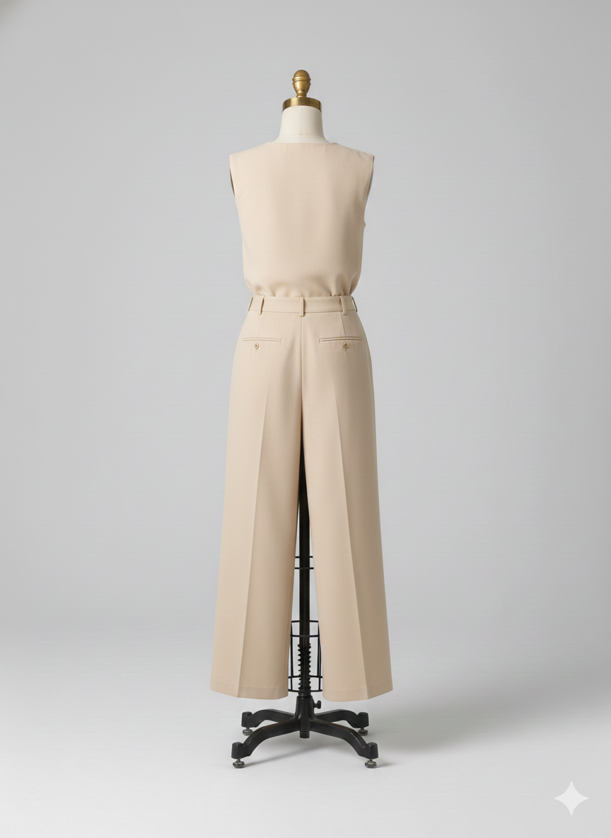 Calça Reta de Cintura Alta: A calça complementa o conjunto com um corte clássico, bolsos funcionais e fechamento discreto, oferecendo conforto e amplitude de movimento.