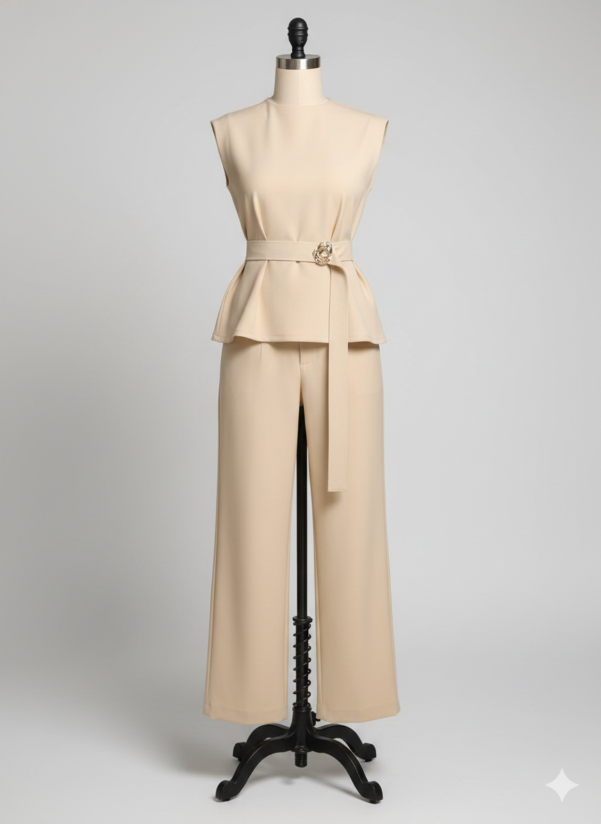 O Conjunto Ana foi criado para quem busca uma imagem polida e moderna. Composto por uma blusa de modelagem peplum estruturada e uma calça de corte reto impecável, este duo monocromático alonga a silhueta e transmite extrema sofisticação através de suas linhas limpas.