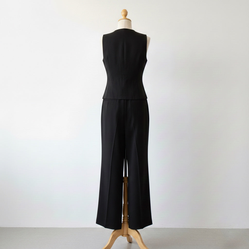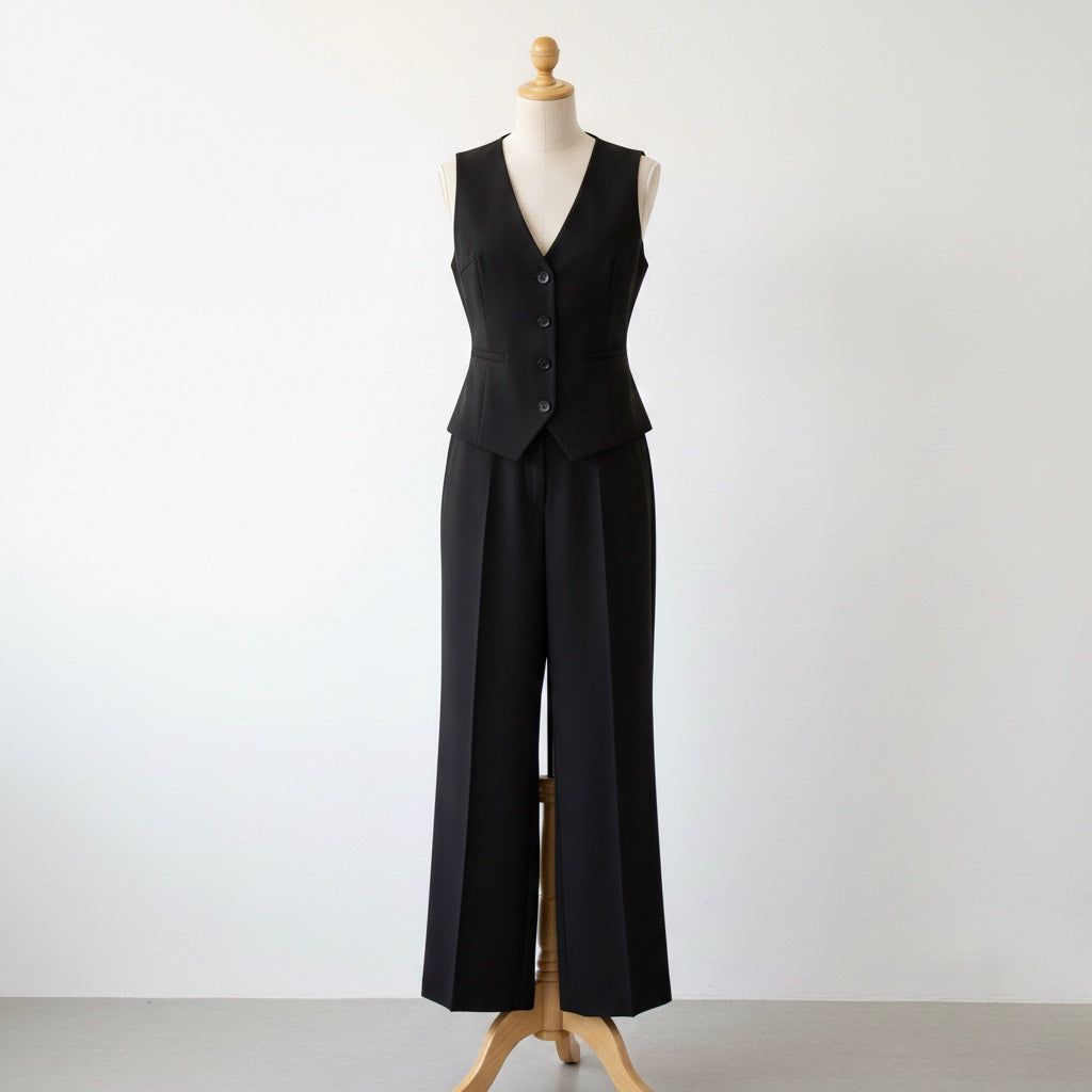 O Conjunto Jade é a união perfeita entre a força da alfaiataria clássica e a fluidez do design moderno. Composto por um colete alongado e uma calça wide leg, este conjunto foi projetado para elevar o seu visual, proporcionando uma silhueta elegante, alongada e extremamente sofisticada.