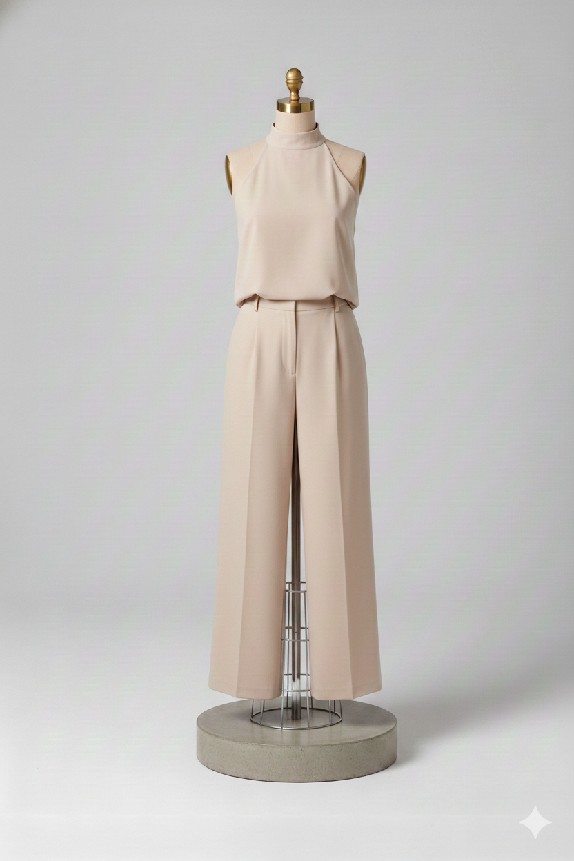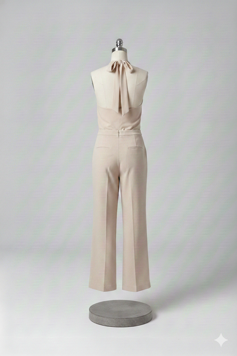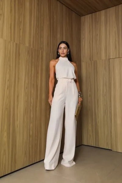 O Conjunto Serena combina a estrutura impecável da calça pantalona com a leveza de uma blusa frente única. O grande diferencial está no fechamento posterior: um laço generoso em tecido que traz feminilidade e movimento, criando um contraste elegante com o corte reto e limpo da calça.