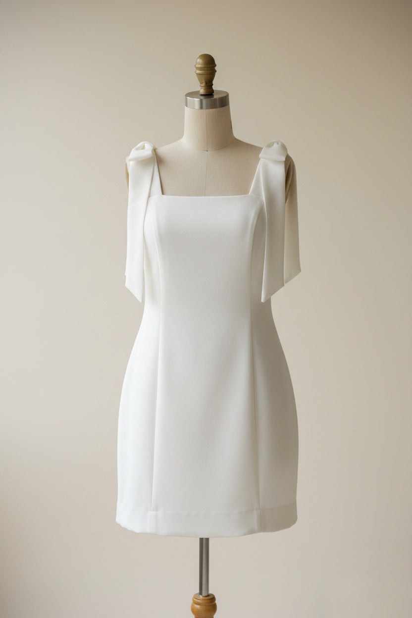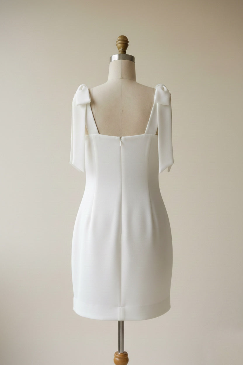 • Laços Estruturados: O grande diferencial está nos ombros, adornados com laços que trazem um volume romântico e moderno, elevando o design básico a um nível de alta costura.