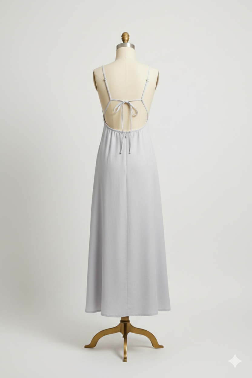 Costas Statement: O grande destaque da peça é o decote posterior amplo, adornado com uma delicada amarração em laço, permitindo o ajuste personalizado das alças e trazendo um charme extra ao visual.